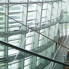 国立新美术馆是日本著名建筑师黑川纪章(Kisho Kurokawa)设计的最后一座美术馆,以「森林中的美术馆」为设计概念,建筑外墙为水蓝色波浪状的玻璃幕墙,曲线优美而富有张力。当参观者置身于美术馆,可以透过玻璃幕墙看到馆外种植的树木,如同身处森林之中。